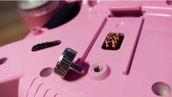 無人機(jī)的機(jī)體前端為云臺(tái)掛架,分別靠螺釘和掛耳固定云臺(tái)前后。中間為六個(gè)pogo pin連接器 ,為機(jī)體和云臺(tái)之間的供能數(shù)傳通道。機(jī)體尾部嵌有限位推紐,用于推送和抽拉電池,往上推動(dòng)可取下電池,往下推動(dòng)鎖死電池。